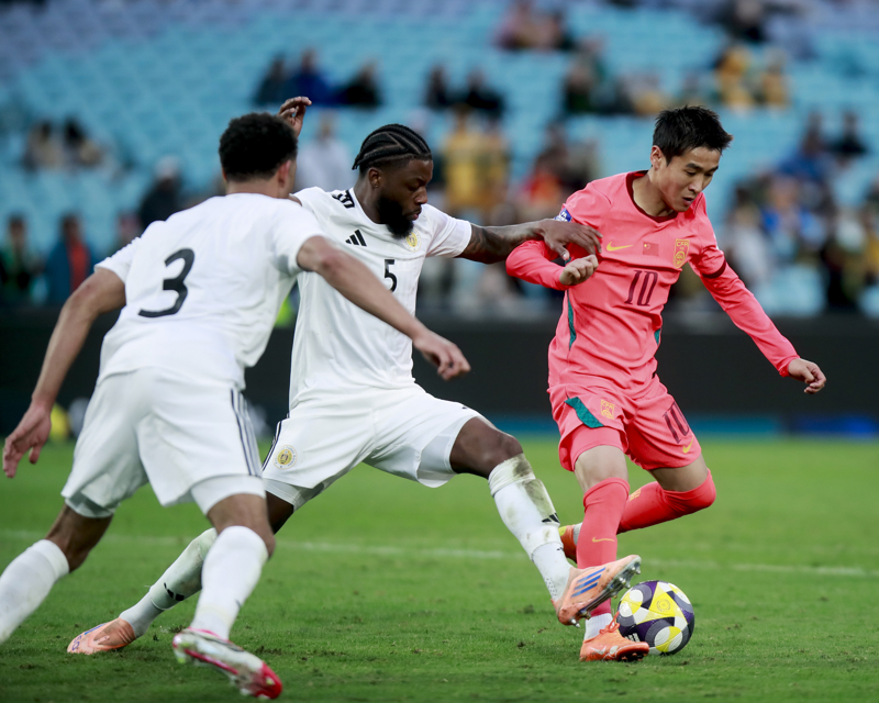 3月27日,中国队球员韦世豪(右)和库拉索队球员谢雷尔·弗洛拉努斯(中)在比赛中拼抢。\n 当地时间3月27日,在澳大利亚悉尼举办的2026年国际足联系列赛中,中国队2比0战胜库拉索队。\n 新华社记者 马平 摄